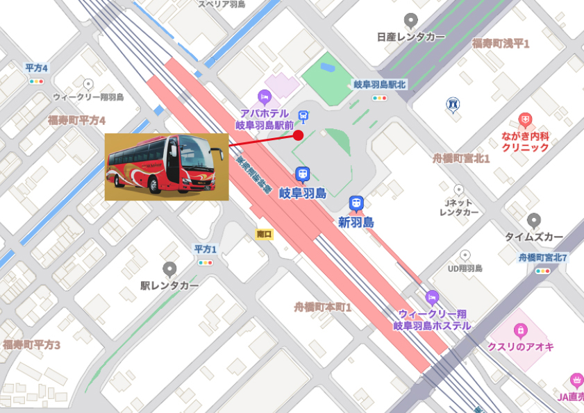 JR岐阜羽島駅北口(改札を出て右手)の地図上に載っています赤いバスがアパホテル前に配車されます。