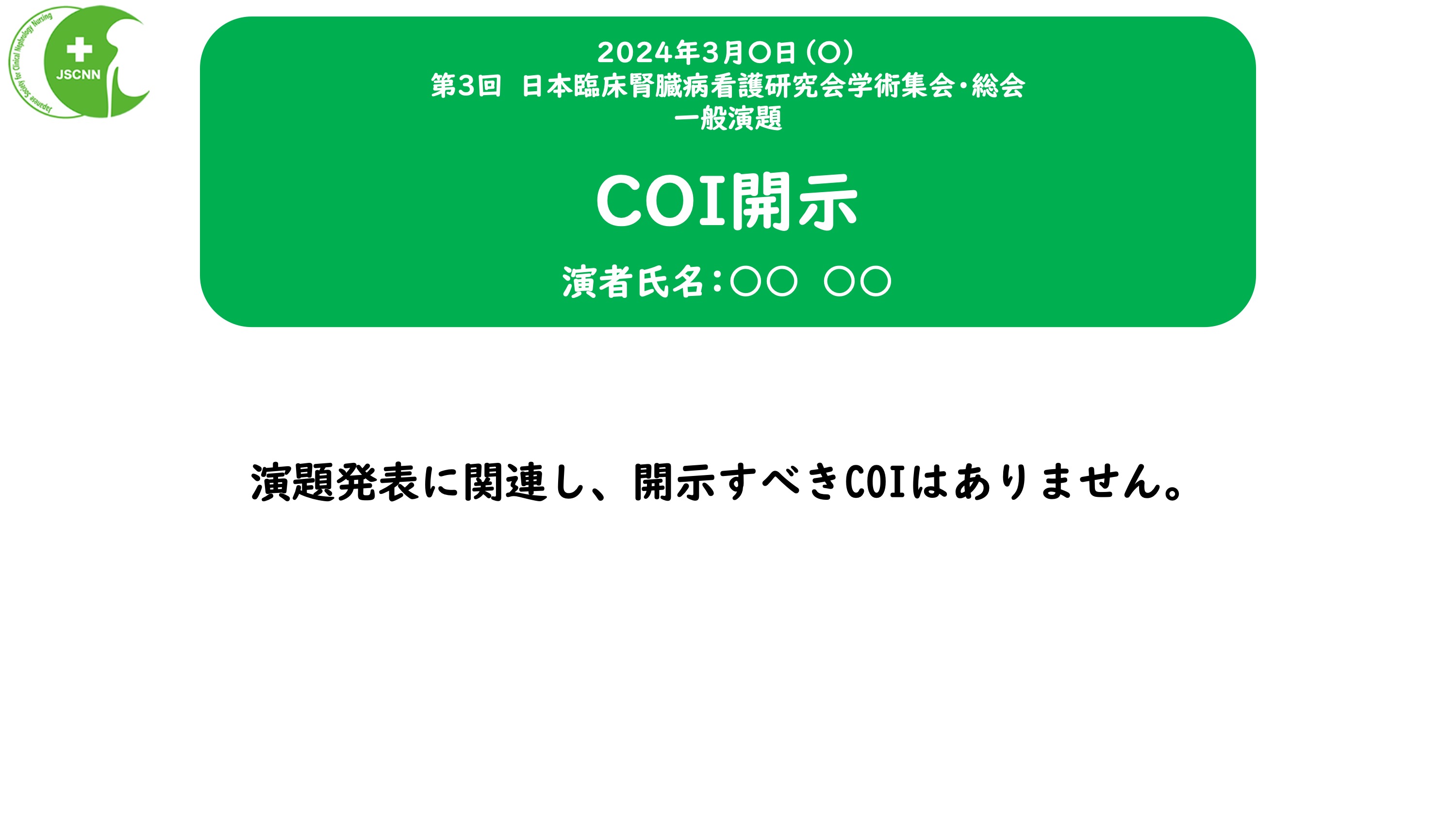 学術集会で発表する際に、発表者はスライドの2枚目の部分に利益相反の有無、および、利益相反がある場合には企業名を掲示してください。