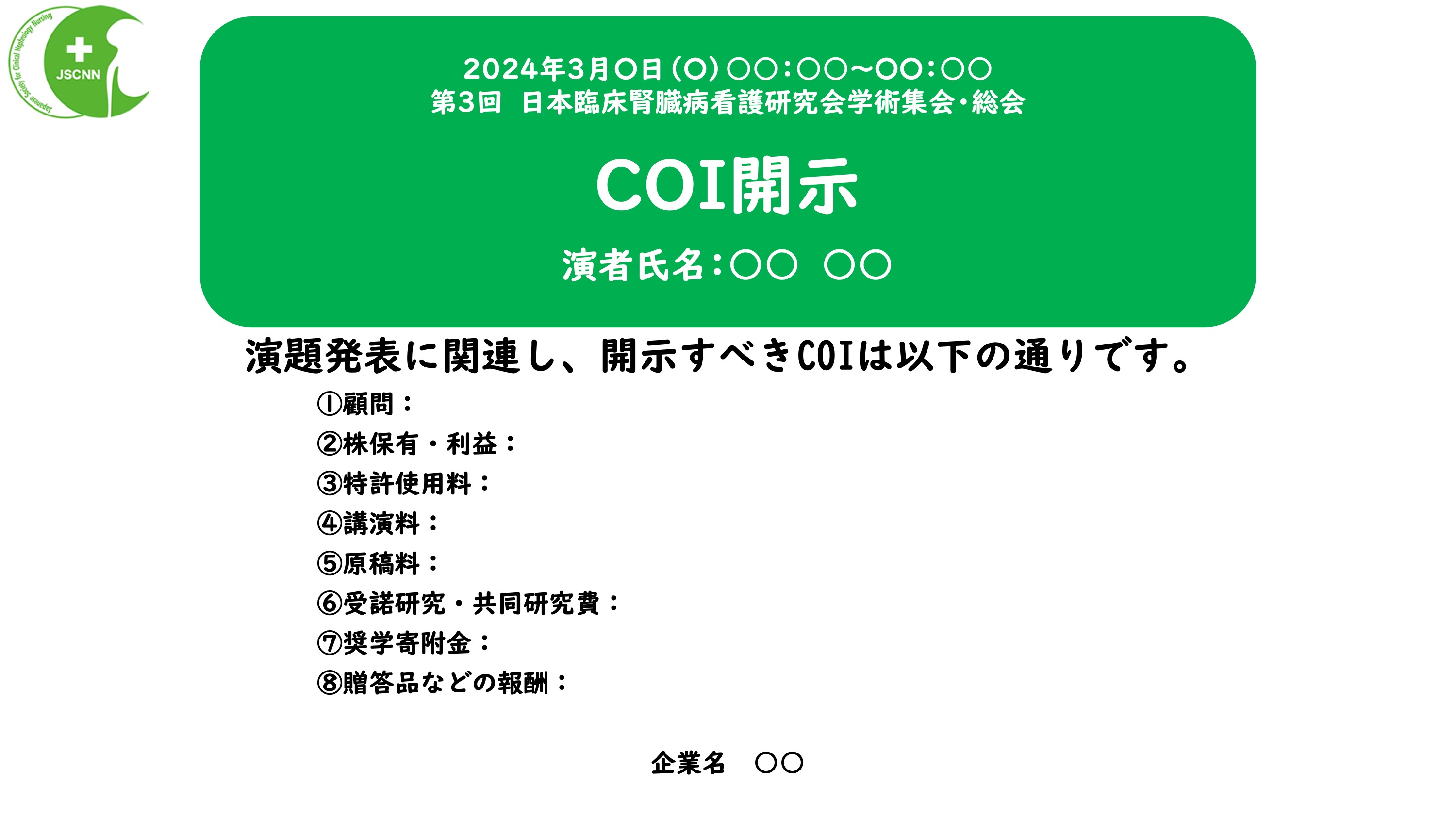 学術集会で発表する際に、発表者はスライドの2枚目の部分に利益相反の有無、および、利益相反がある場合には企業名を掲示してください。